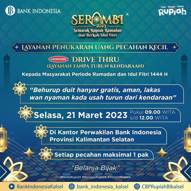 Kedua, layanan tukar uang tanpa turun kendaraan di kantor BI Kalsel, Jl. Lambung Mangkurat No.15 Banjarmasin, akan dilakukan sebanyak sembilan kali. Yaitu pada pembukaan kegiatan SERAMBI 2023 tanggal 21 Maret 2023, kemudian tanggal 3 s.d. 6 April 2023, dan tanggal 10 s.d. 13 April 2023.