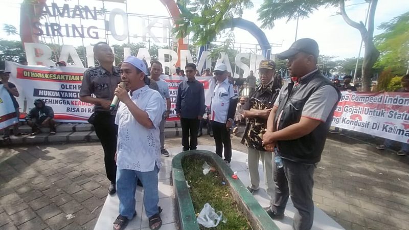 BANJARMASIN – Gabungan Lembaga Swadaya Masyarakat (LSM) Barisan Anak Bangsa Anti Kecurangan (BABAK) Kalimanatan Selatan (Kalsel) Bersama LSM Banua Kalsel menggelar aksi damai dalam memperingati Hari Lahir Pancasila di depan nol Kilometer Banjarmasin, Provinsi Kalimantan Selatan, Jumat (2/6/2023).