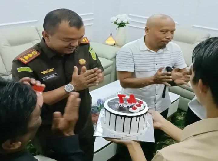 Para jurnalis datang secara kompak membawa kue ulang tahun dan langsung memasuki ruang kerja Kajari. Kehangatan terpancar saat Munandar menyambut kedatangan mereka, disertai suasana haru sekaligus penuh kekeluargaan.
