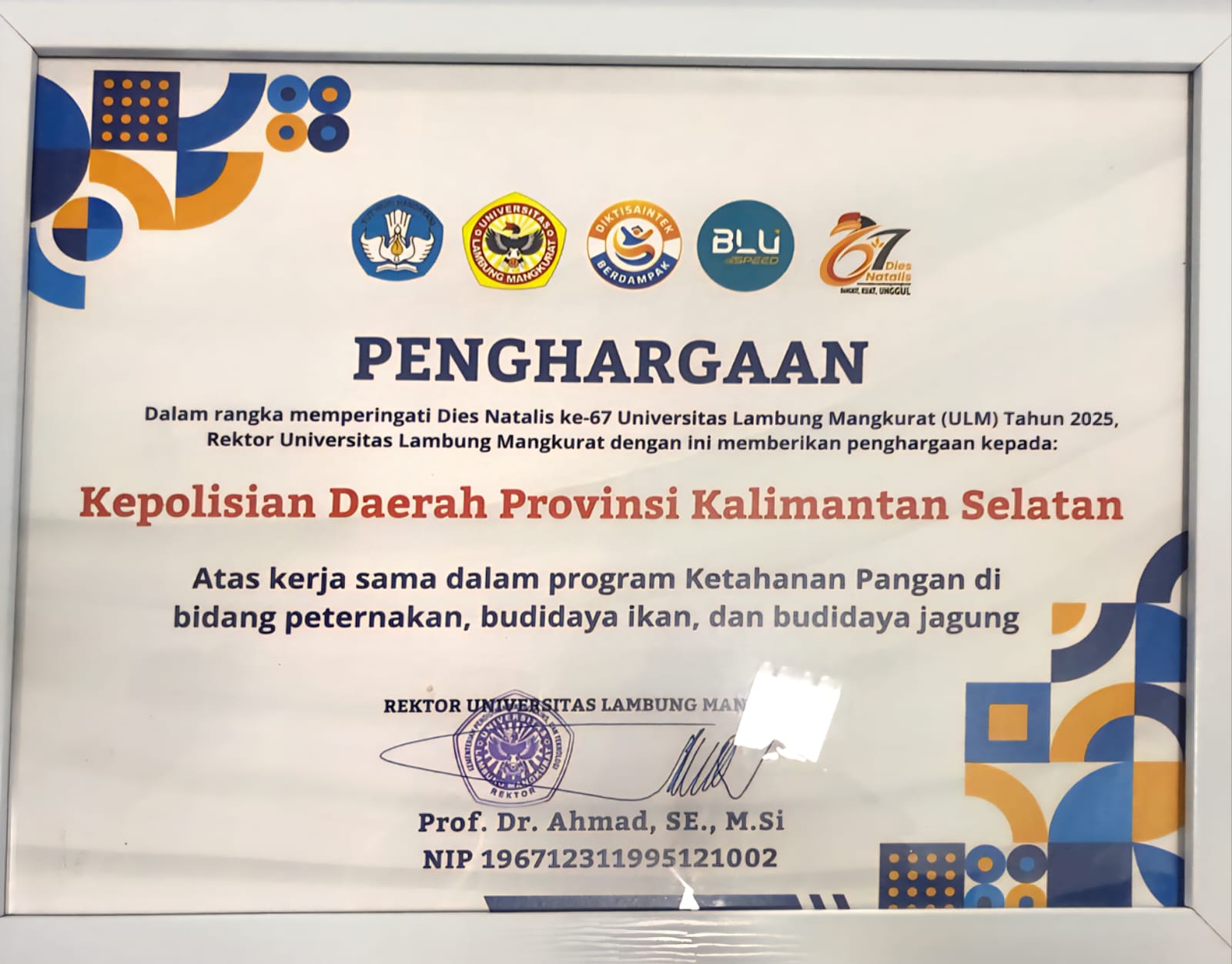 Terbitkalimantan.com, Banjarbaru – Kepedulian Polda Kalimantan Selatan (Kalsel) dalam mendorong ketahanan pangan akhirnya menuai penghargaan. Pada puncak Dies Natalis ke-67 Universitas Lambung Mangkurat (ULM), Senin (22/9/2025), ULM menganugerahkan penghargaan Mitra Utama Strategis kepada Polda Kalsel.