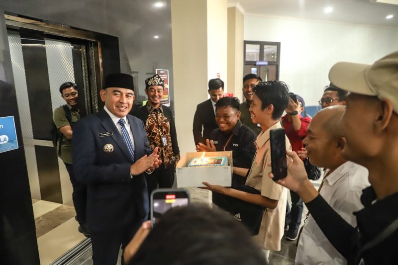 Para wartawan kemudian menyodorkan sebuah kue ulang tahun bergambar wajah sang Bupati dengan seragam resmi. Suasana pun berubah hangat penuh tawa. Rahmat terlihat gembira menerima kejutan itu, bahkan memadamkan lilin dengan jari alih-alih meniupnya.