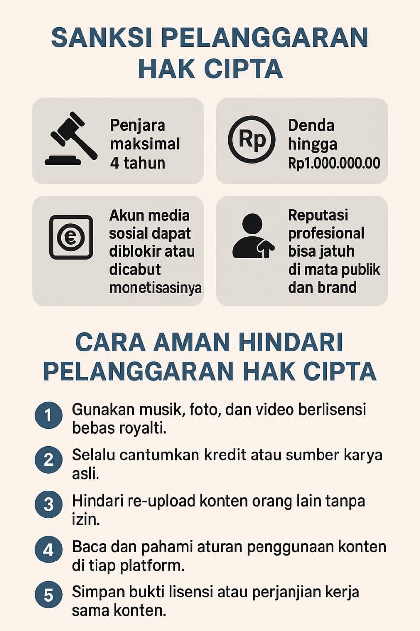 “Content creator wajib memahami bahwa semua karya orang lain tidak boleh digunakan sembarangan. Jika melanggar, bisa dikenakan pidana dan denda yang cukup besar,” ujarnya, Minggu (5/10/2025).