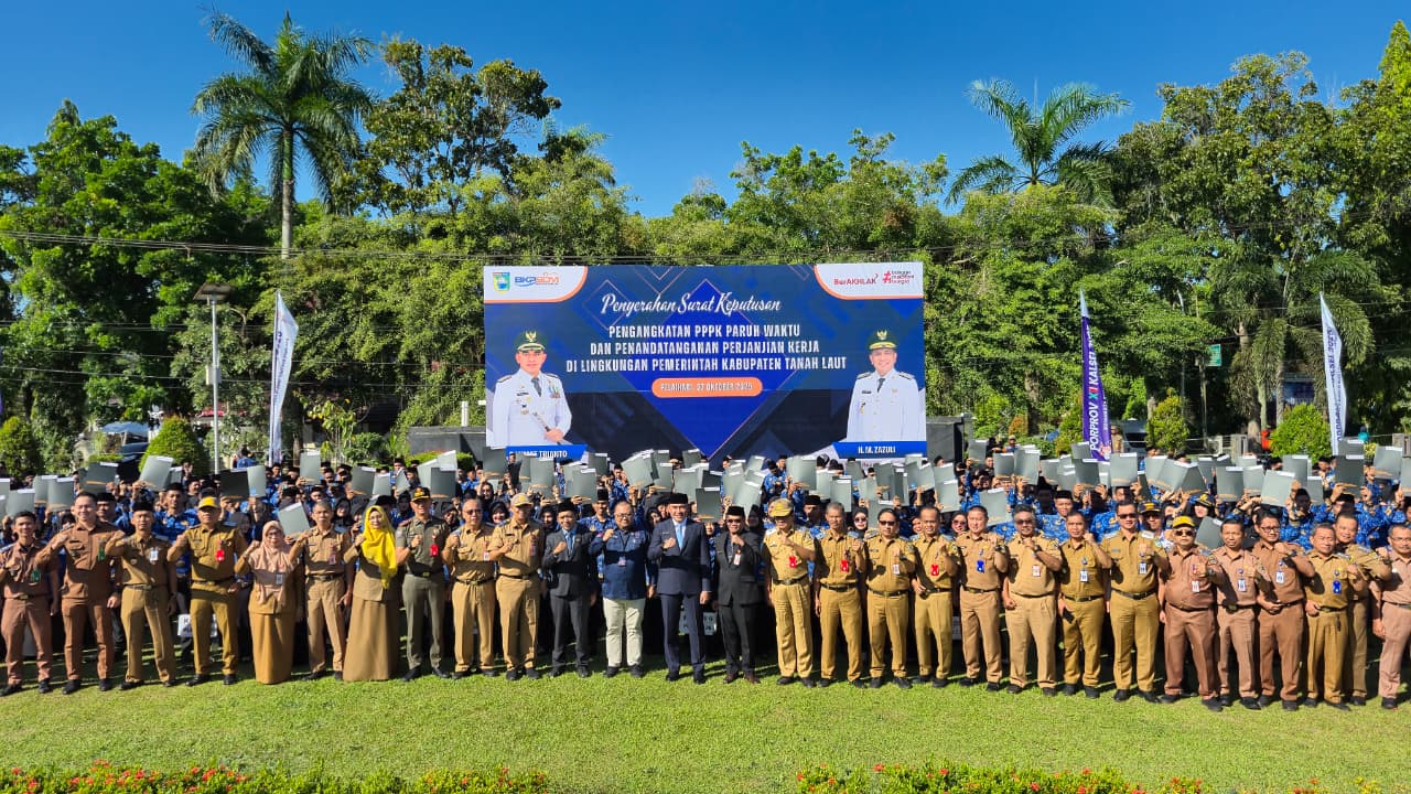 Terbitkalimantan.com, Pelaihari – Pemerintah Kabupaten Tanah Laut resmi menyerahkan Surat Keputusan (SK) Pengangkatan Pegawai Pemerintah dengan Perjanjian Kerja (PPPK) Paruh Waktu kepada 2.655 tenaga di Halaman Kantor Bupati Tanah Laut, Selasa (7/10/2025).