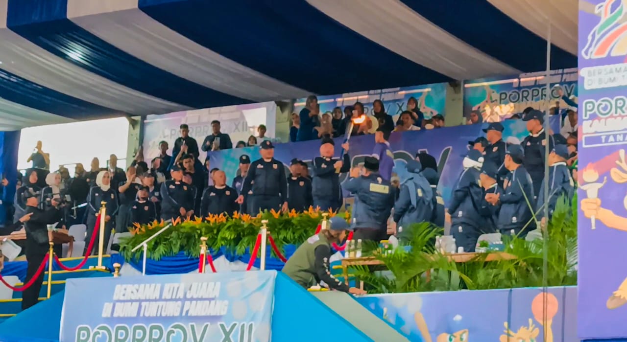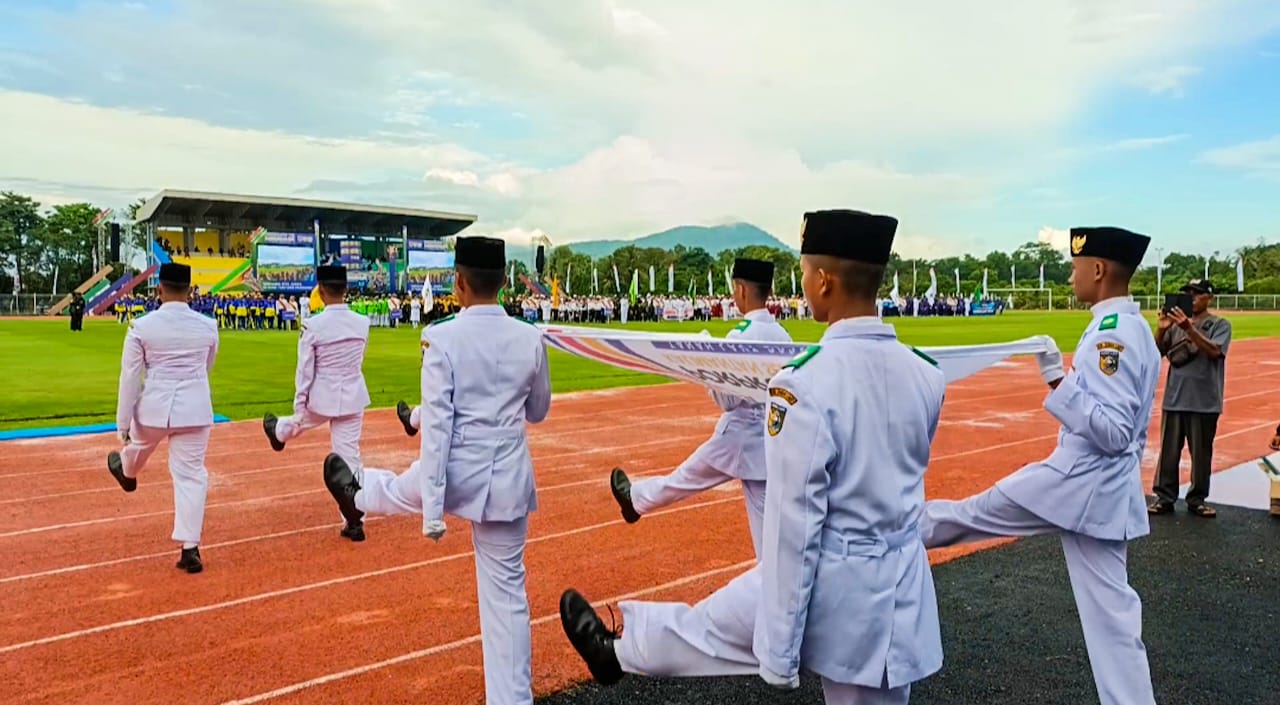 Kemeriahan semakin terasa ketika bendera Porprov XII dikibarkan oleh pasukan Paskibraka Tanah Laut, menandai dimulainya pesta olahraga terbesar di tingkat provinsi tersebut.