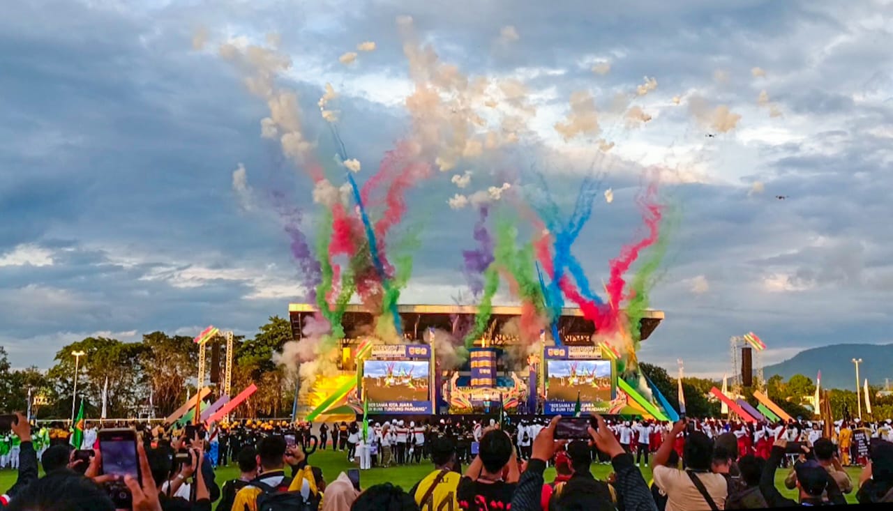 Meski sempat tertunda akibat hujan deras, semangat ribuan atlet dan tamu undangan tak surut sedikit pun. Begitu hujan reda, suasana stadion langsung pecah oleh tepuk tangan penonton saat pertunjukan tari kolosal membuka rangkaian acara. Ratusan penari yang terdiri dari perwakilan berbagai kontingen tampil memukau, menampilkan semangat sportivitas dan kebersamaan.