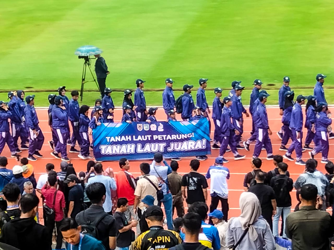 Sorak-sorai penonton semakin bergemuruh saat defile kontingen dari 13 kabupaten dan kota se-Kalimantan Selatan memasuki stadion. Para atlet tampil bersemangat sambil meneriakkan yel-yel khas daerah, menebarkan aura kompetisi yang sehat dan penuh kebanggaan.