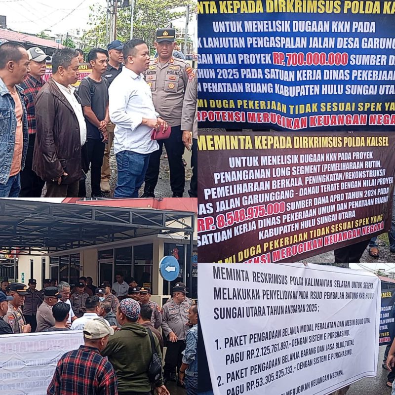 Terbitkalimantan.com, BANJARMASIN – Desakan publik terhadap penegakan hukum di Kabupaten Hulu Sungai Utara (HSU) kian menguat. Ratusan massa dari Kelompok Masyarakat Pemerhati Banua (KMPB) dan sejumlah aliansi LSM kembali menggeruduk Ditreskrimsus Polda Kalimantan Selatan, Kamis (20/11/2025), membawa tuntutan yang lebih spesifik dan mengarah pada dugaan penyimpangan anggaran berskala besar.