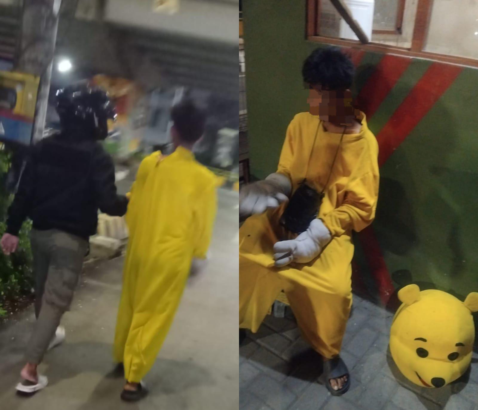 Dalam foto yang terekam tim di lapangan, pengemis yang mengenakan kostum kuning lengkap dengan kepala bonekanya tampak dibawa petugas untuk diamankan. Petugas menyebut pola seperti ini sudah terjadi berulang kali.