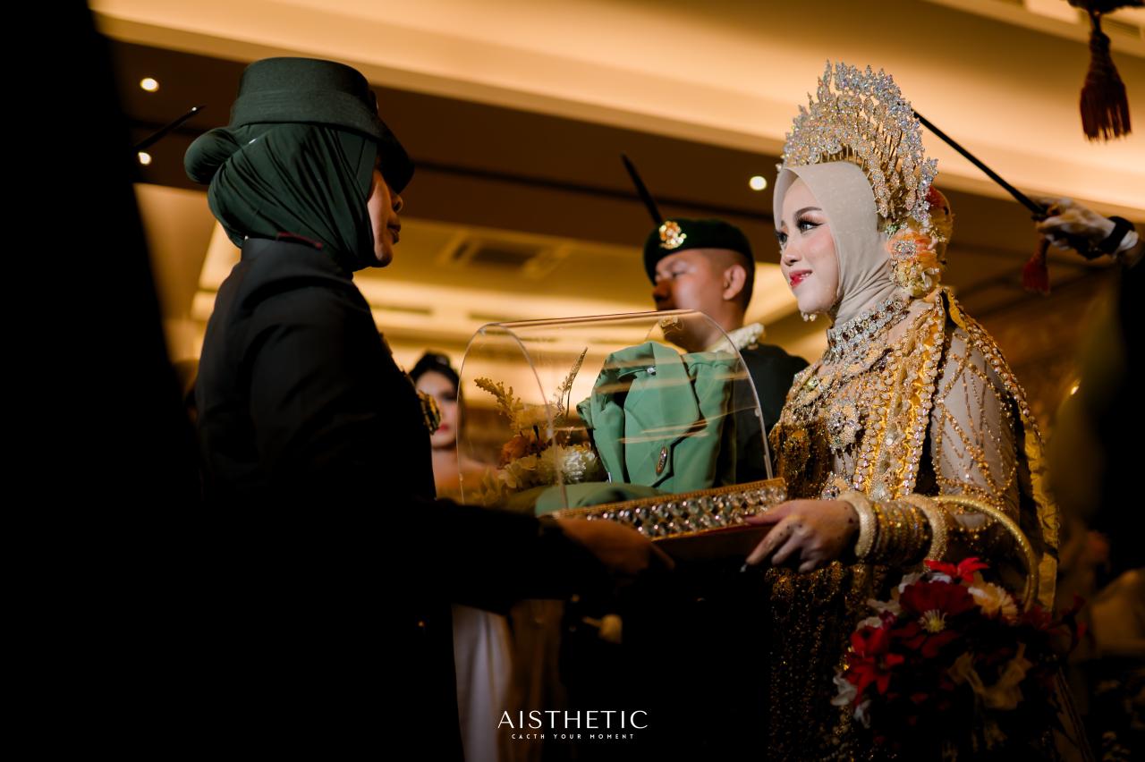 Momen penyerahan mempelai wanita oleh sang tante, Kolonel Nurjanah Suat, S.Pd., M.Si., menjadi salah satu titik paling mengharukan. Dengan penuh keteguhan dan kasih, prosesi tersebut menandai kepercayaan keluarga besar untuk menitipkan Amelia Syifa dalam bahtera rumah tangga yang baru.