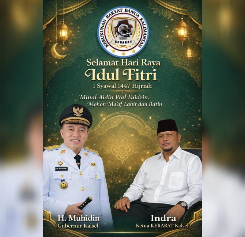 Dalam nuansa religius yang penuh kehangatan tersebut, Keluarga Besar Kerukunan Rakyat Banua Kalimantan (KERABAT) Kalimantan Selatan melalui Ketua, Indra Jaya—yang akrab disapa Indrai—menyampaikan ucapan Idulfitri kepada Gubernur Kalimantan Selatan, H. Muhidin, beserta keluarga.